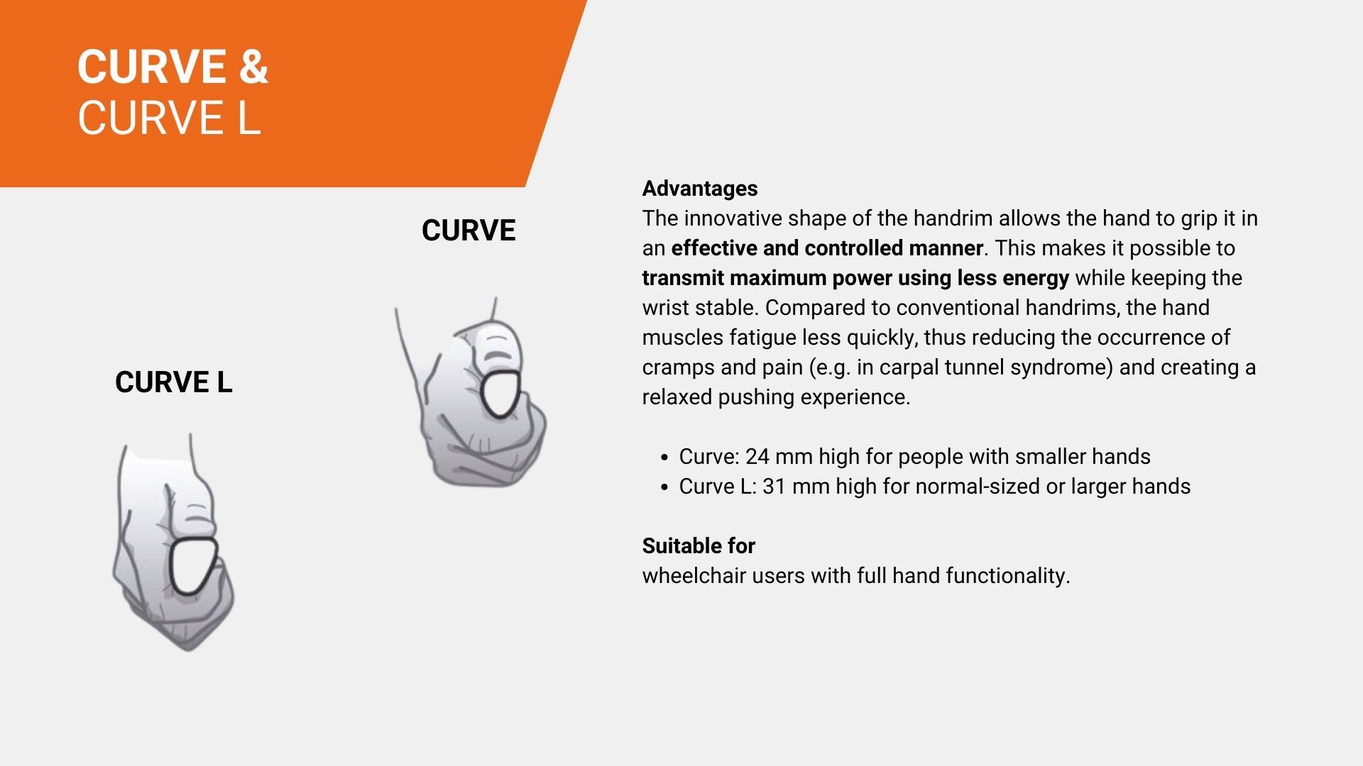 The innovative shape of the handrail allows your hand to grasp it in an effective and controlled manner. This allows you to transmit maximum power using less energy while keeping your wrist stable. Compared to conventional handrails, the hand muscles fatigue less quickly, thus reducing the occurrence of cramps and pain (e.g. in carpal tunnel syndrome) and creating a relaxed pushing experience.