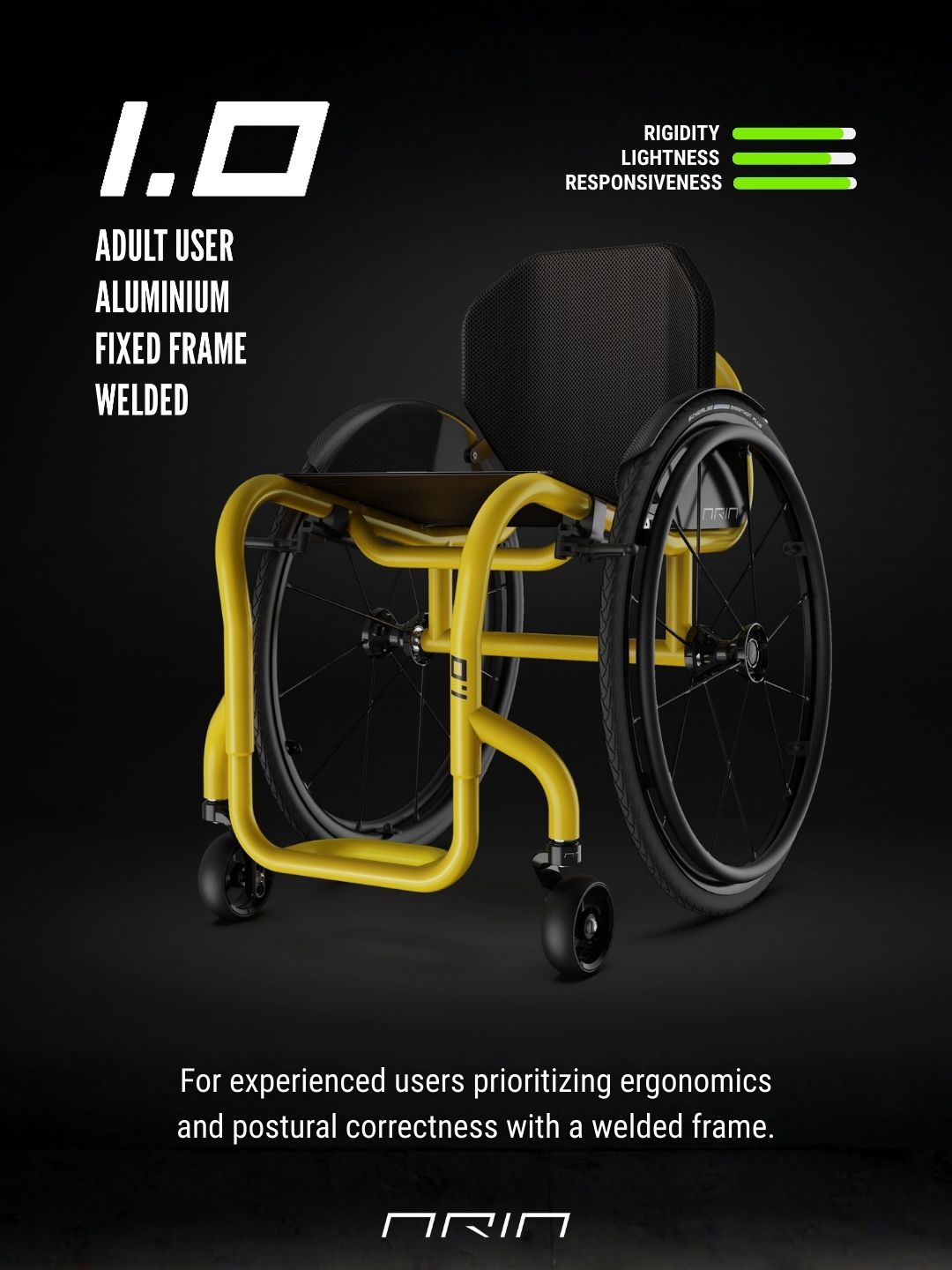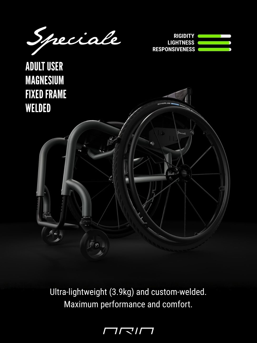 Aria 1.0 and Speciale: pure performance: Models 1.0 and Speciale represent the pinnacle in terms of lightness (transport weight ± 4 kg), structural rigidity, and propulsion efficiency. These models have minimal to no adjustments, acting as custom-welded/fixed frame wheelchairs.