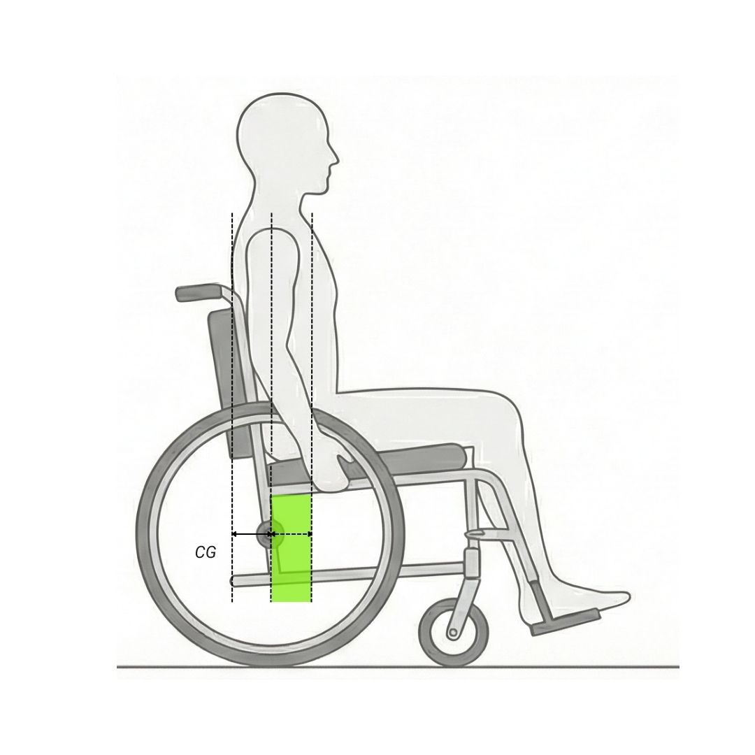 Rearward CG (conservative setups, lower numerical values, e.g., 80-100 mm): By positioning the wheel axle further back, the wheelchair's wheelbase increases, and rearward tipping becomes extremely difficult.
