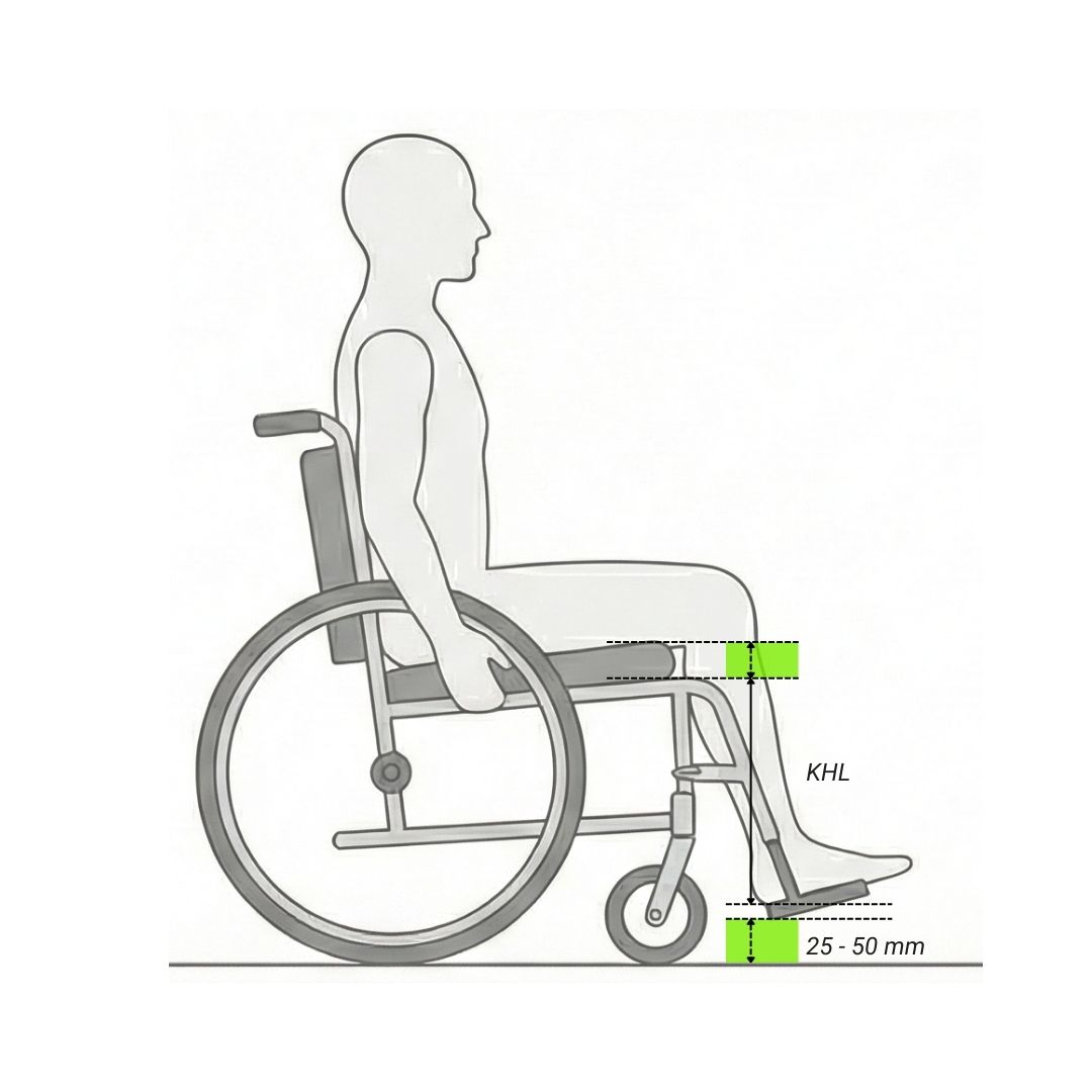 The seat height is determined by the length of the user's leg (to ensure a footrest height of about 25-50 mm from the ground to overcome small obstacles), but it must interface with the environment: bed height for transfers, car seat height, and accessibility under tables and desks.
