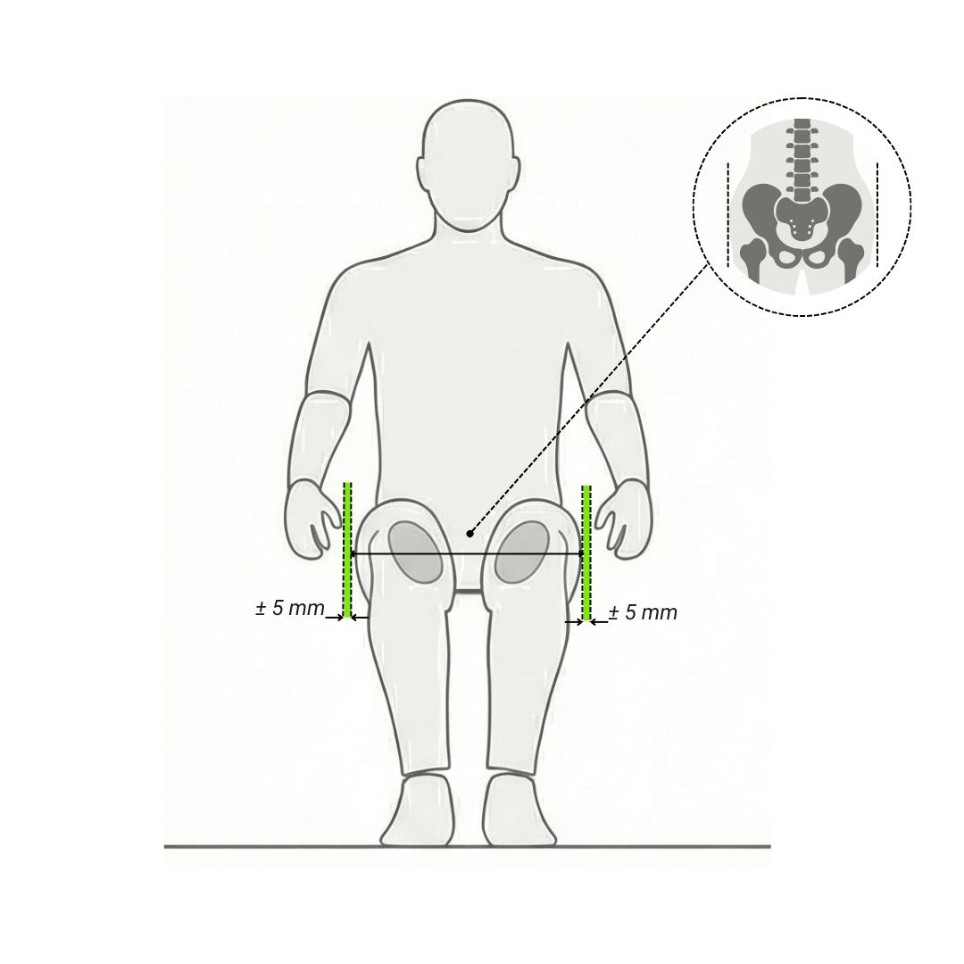 Pay attention to asymmetries: at this stage, it is vital to separately measure the right limb (Sacrum to Right Popliteal Fossa) and the left limb (Sacrum to Left Popliteal Fossa). In the presence of asymmetry (e.g., a difference in femur length or a structured pelvic rotation/obliquity), the shortest measurement must always be taken into consideration to establish the correct seat depth.