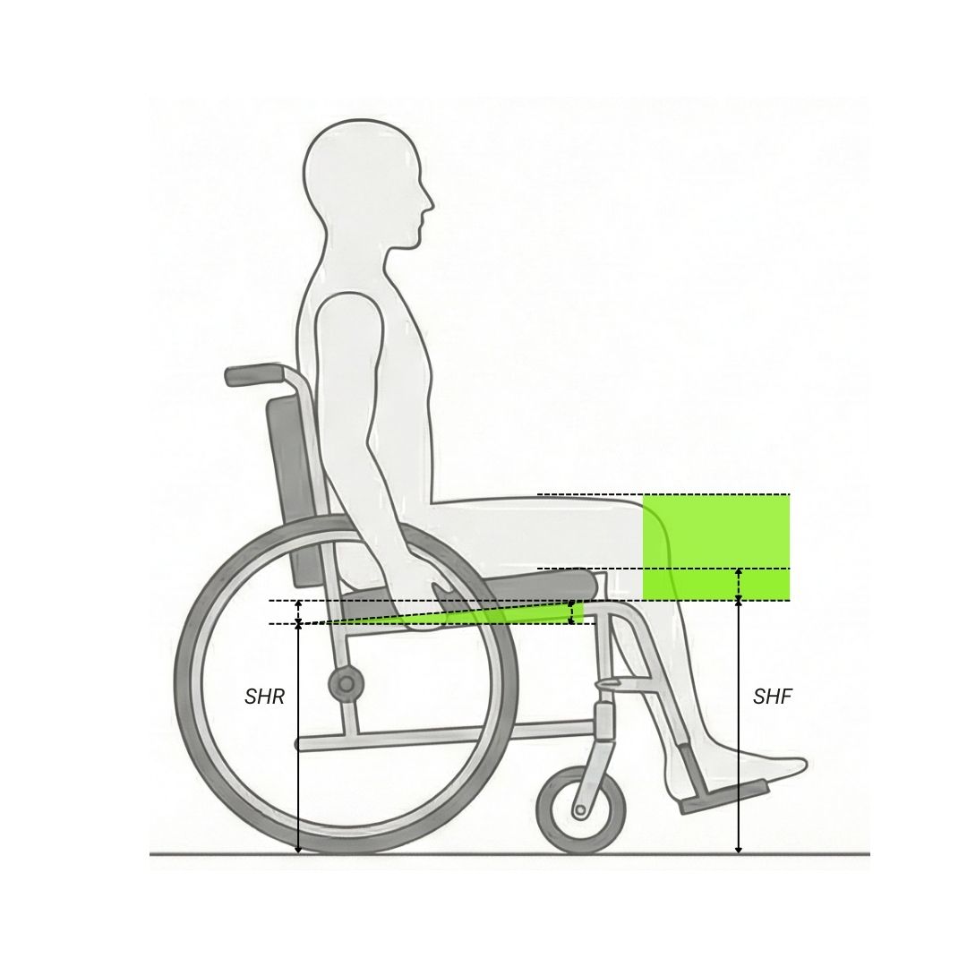 Front Height (SHF): Determines accessibility to the surrounding environment (e.g., fitting under tables) and the ease of transfers. An excessive front height makes independent transfers complex and prevents the feet from touching the ground if necessary. A height that is too low exposes the footrests to the risk of hitting the ground or obstacles, and can increase pressure on the buttocks.