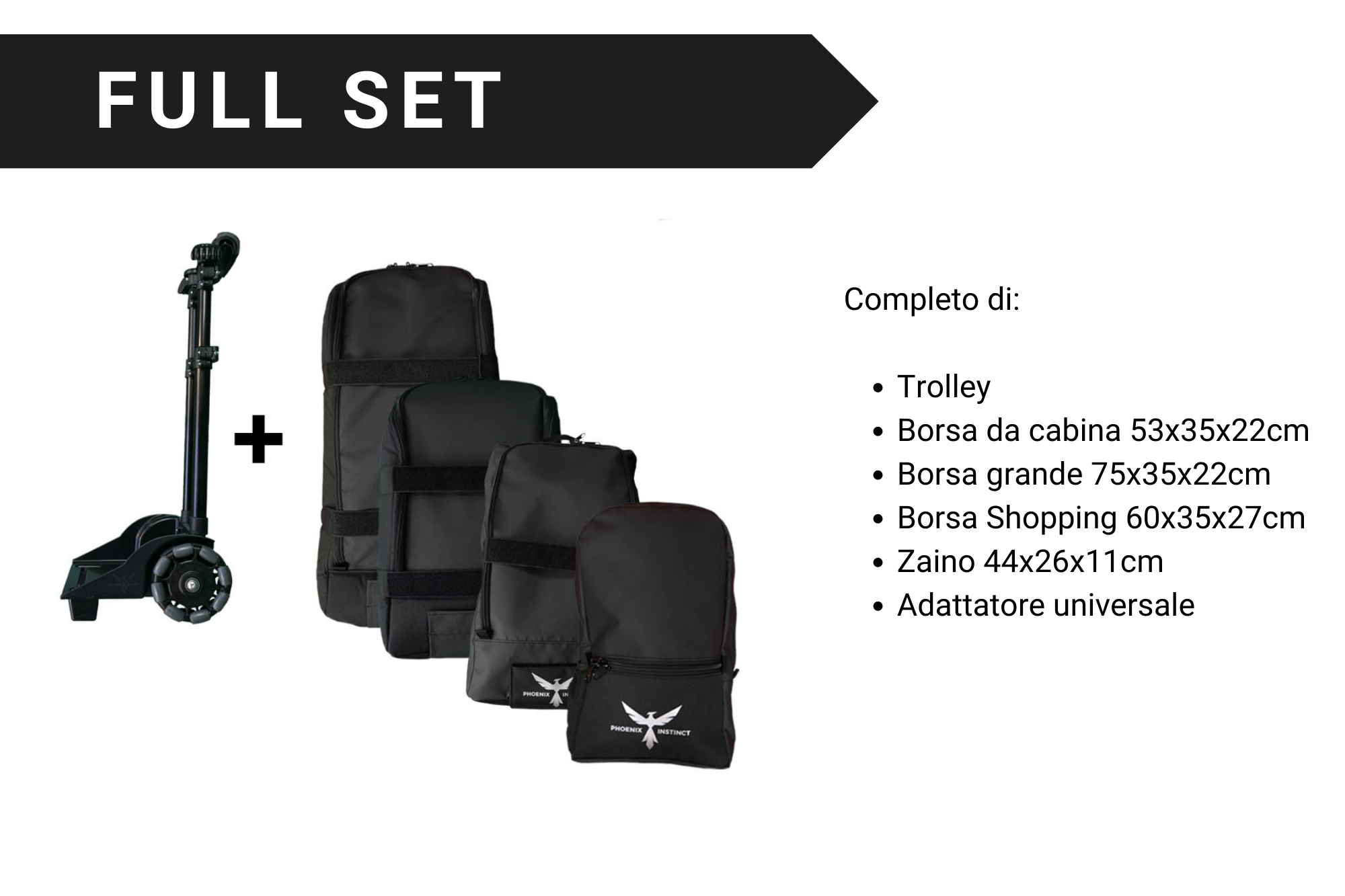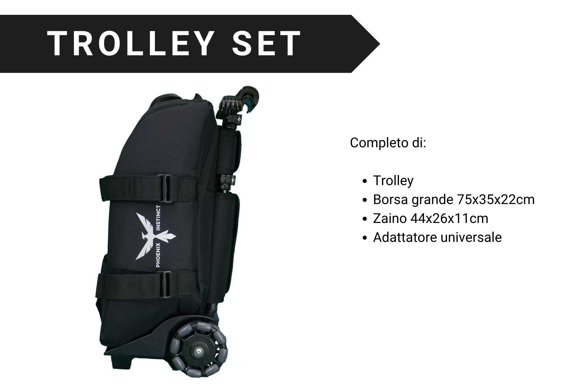I bagagli Phoenix sono dotati di un supporto che si aggancia saldamente a una barra orizzontale sulla carrozzina. Se la carrozzina dispone di una barra sullo schienale, diventa un punto di attacco per il bagaglio. Nei casi in cui la carrozzina non abbia una barra sullo schienale, Phoenix Instinct offre un adattatore universale che crea un punto di aggancio. Attaccare il bagaglio alla carrozzina è un processo semplice: l'utente si posiziona con il bagaglio alle spalle, inclina il bagaglio per allineare il supporto con la barra orizzontale o l'adattatore universale e spinge verso il basso per bloccare il bagaglio in posizione.