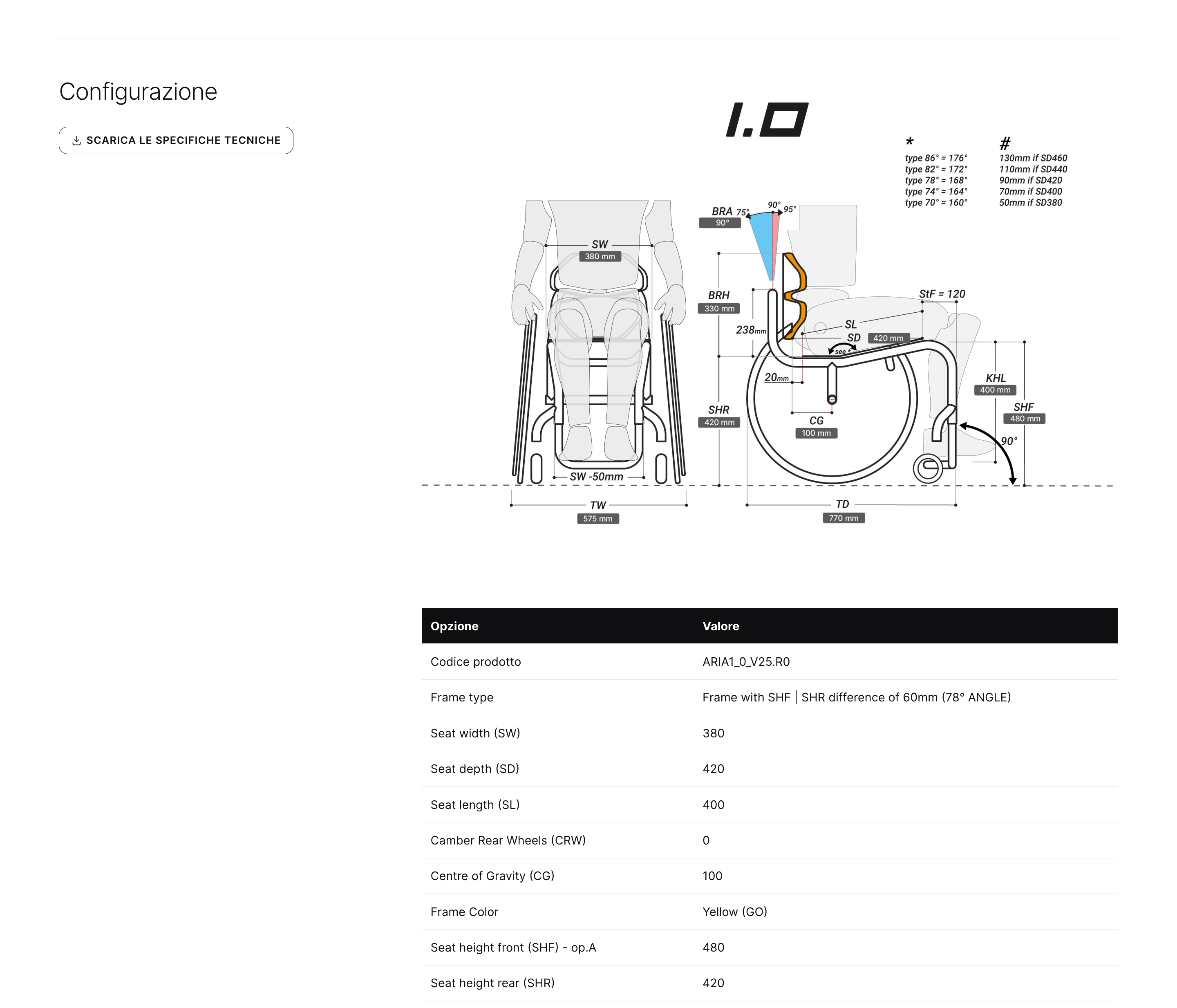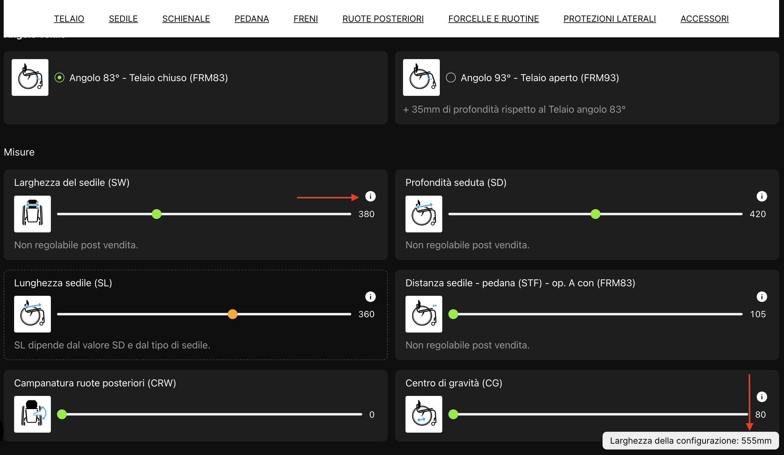 Noterai che la larghezza della carrozzina si aggiorna automaticamente modificando la larghezza della seduta. Questa informazione è molto utile all'utente, nel caso avesse specifiche necessità dimensionali (es. se utilizza un ascensore)