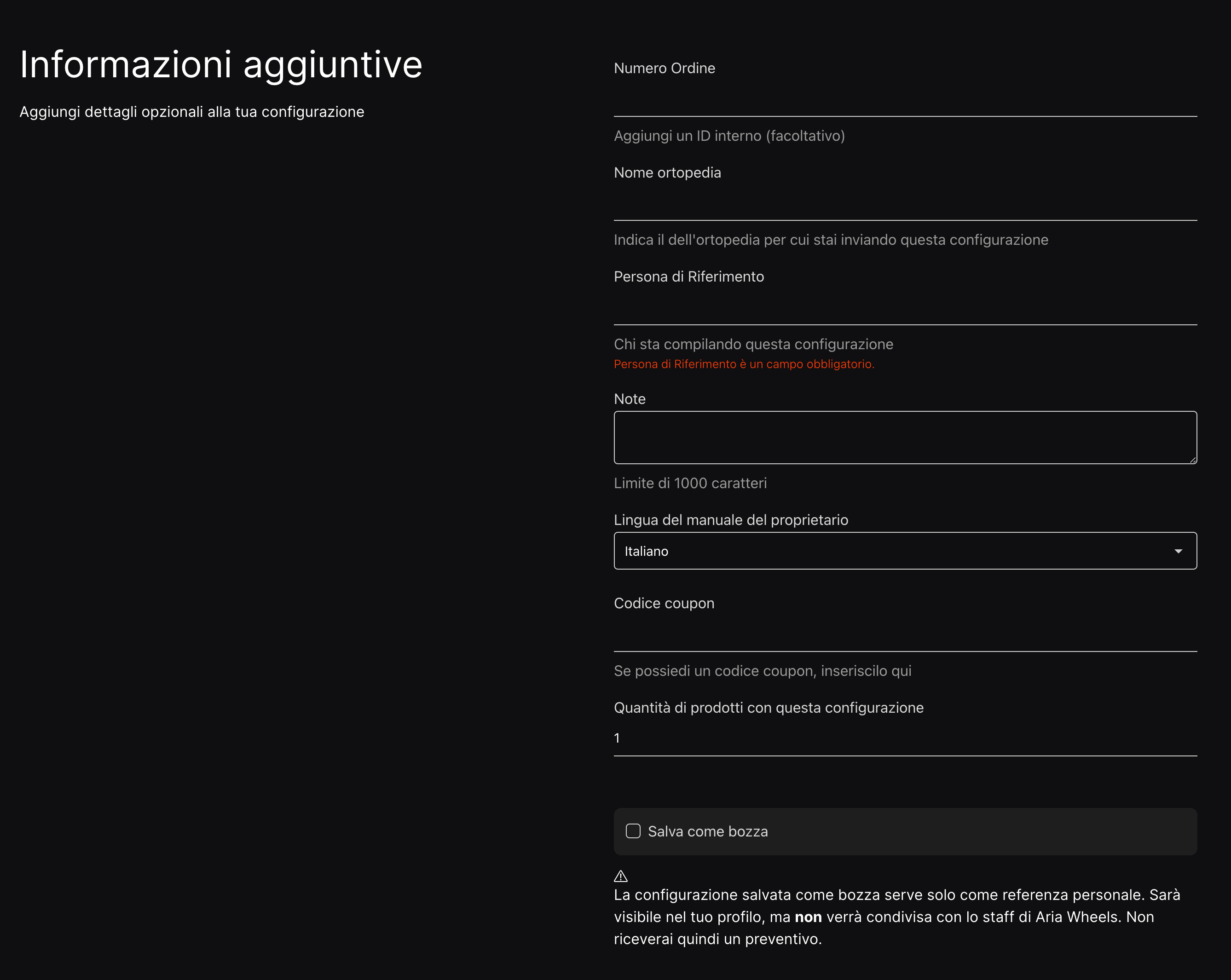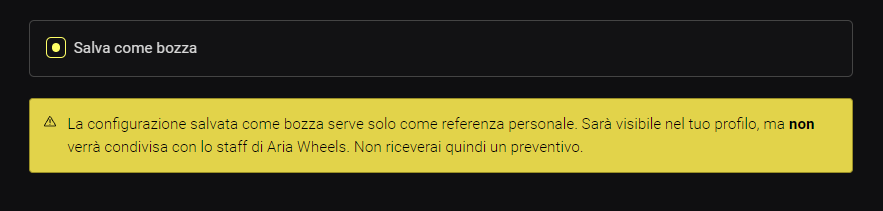 Nel caso in cui non sei certo della configurazione, puoi salvarla come BOZZA spuntando l'apposita casella: in questo modo, la configurazione sarà salvata nella sezione Configurazioni Inviate del tuo account, ma non verrà inviata ad Aria per procedere con il preventivo.