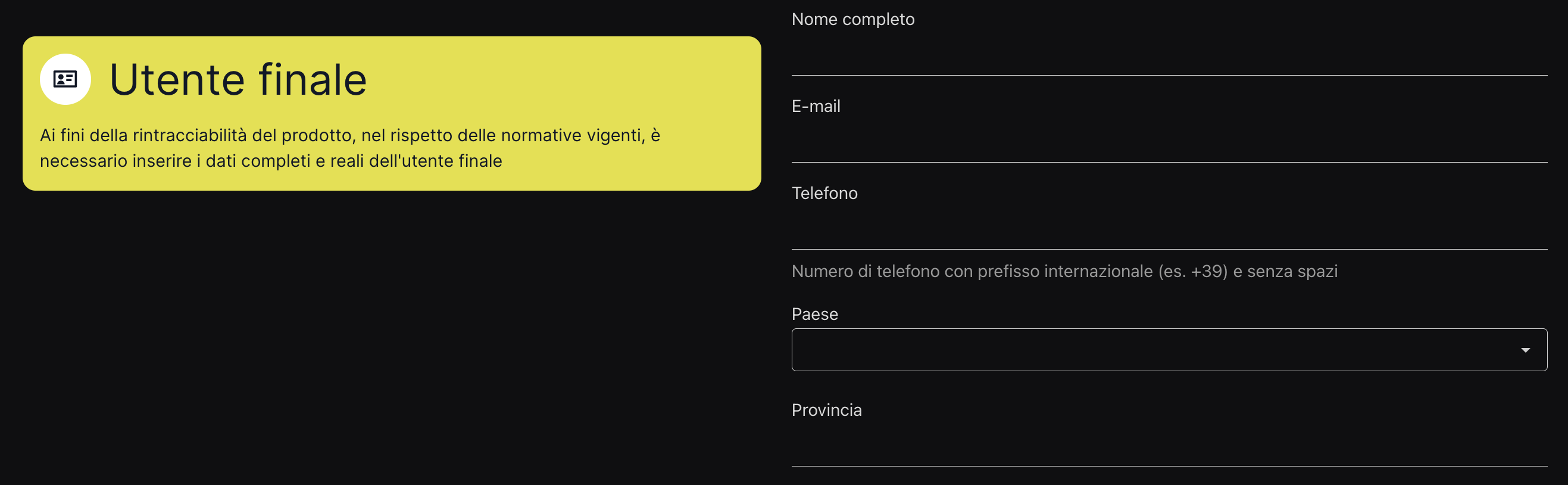 Infine, inserisci le informazioni dell'utente finale: nome, e-mail, telefono, paese (seleziona la nazione di riferimento nell'elenco a tendina) e provincia.