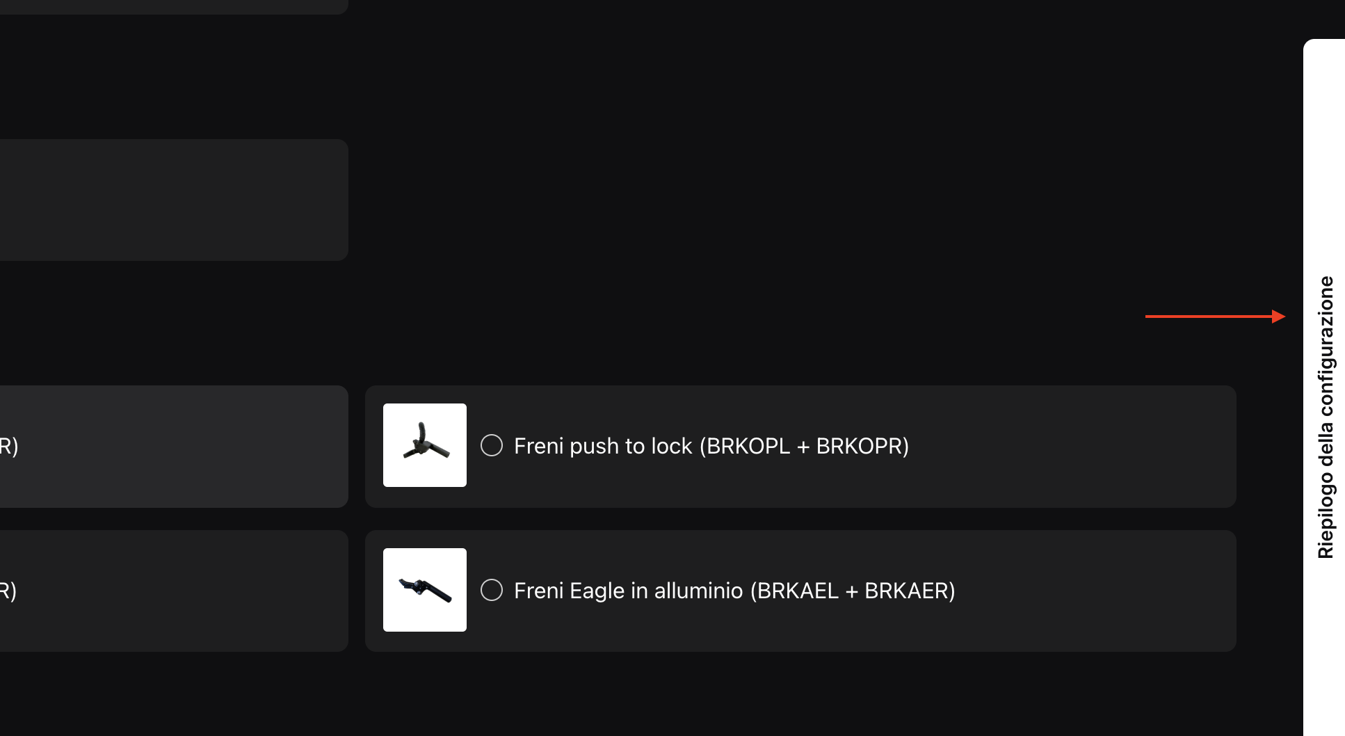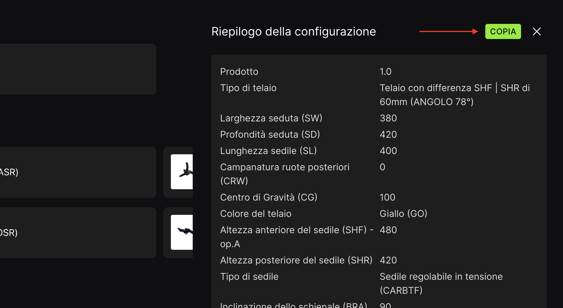 Durante la compilazione puoi consultare il riepilogo delle selezioni impostate, ogni costo extra, la larghezza della carrozzina e il prezzo di vendita suggerito aprendo la finestra RIEPILOGO DELLA CONFIGURAZIONE tramite la tendina a destra della schermata.